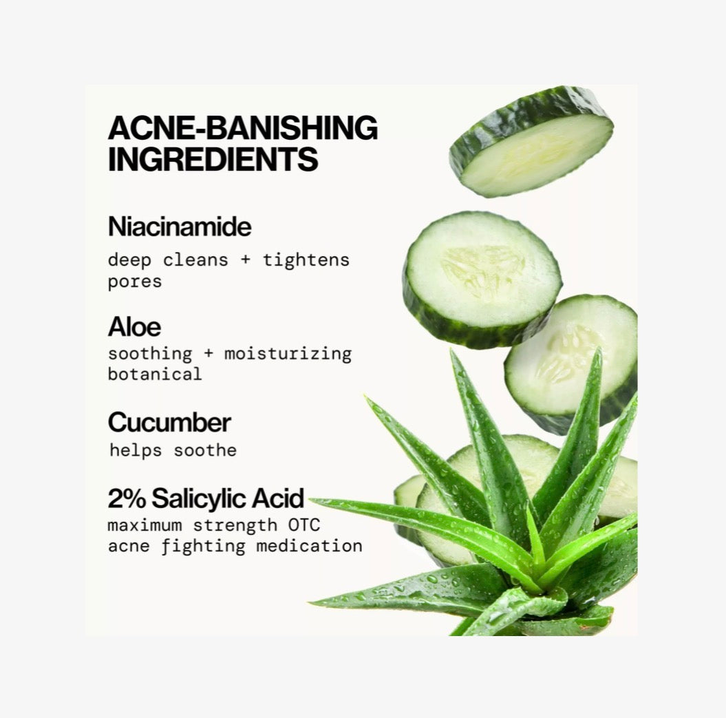 Enriquecido con niacinamida, aloe vera y pepino, calma, hidrata y equilibra la piel mientras trata el acné activo, siendo ideal incluso para pieles sensibles.